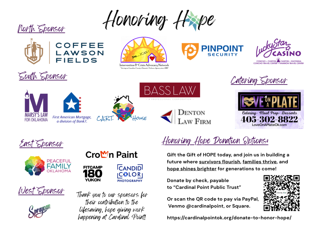 Cardinal Point is the direction of hope for survivors of domestic violence, sexual assault, stalking, and child abuse for Canadian County. This event is vital to the ongoing success and progress Cardinal Point has made toward creating a future where survivors flourish, families thrive, and violence subsides.